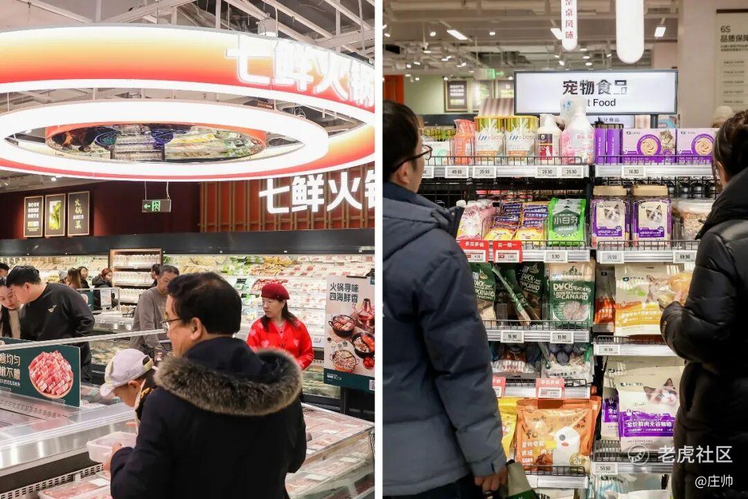 非常有特色的是,通过设计多种主题生活场景和品类进行分区,如“七鲜酒馆”专区、火锅专区、宠物食品区、本地化熟食明档专区、水产专区、自有品牌专区等主题岛台,以及统一的灯牌指引,营造沉浸式、场景化的购物体验,更直观便捷地满足个性化的需求。