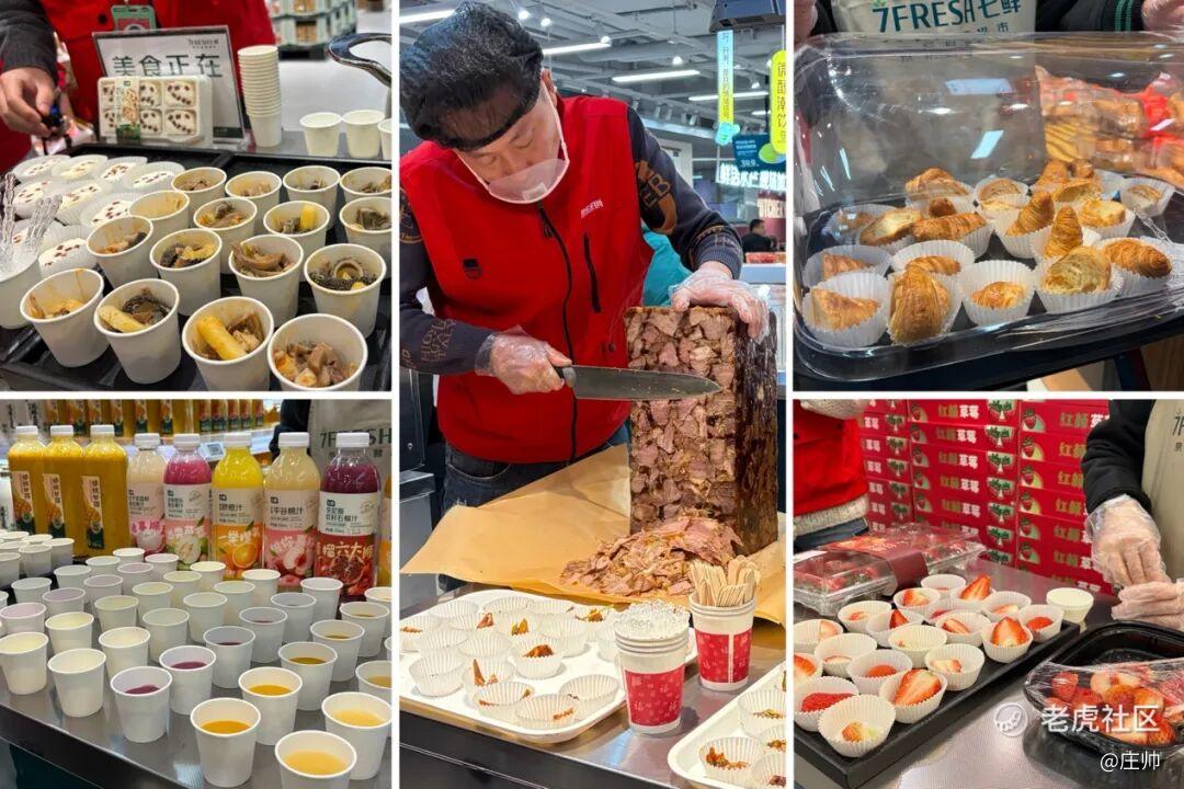 不同于山姆需要会员费才能进店试吃试喝,京东七鲜的新开门店设置了高达30~40个的试吃点位,提供大份量试吃(如整块蛋糕),任何人均可以进店免费“试吃到饱、试喝到够”。