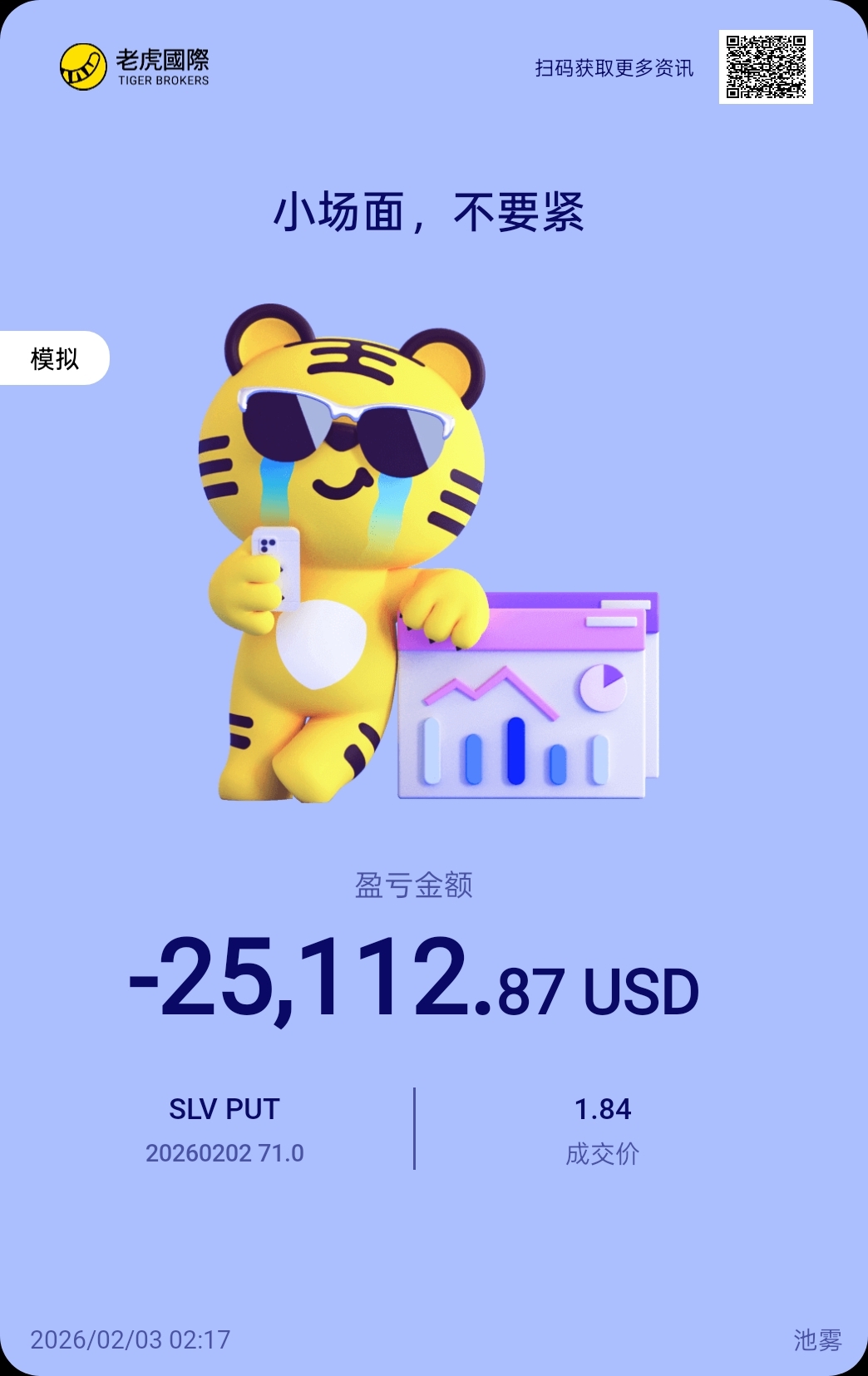 $SLV 20260202 71.0 PUT$ 买了157手,看对了方向,降波了,$SLV 20260204 70.0 PUT$ 还是亏钱。。。模拟盘都赢不了,唉。