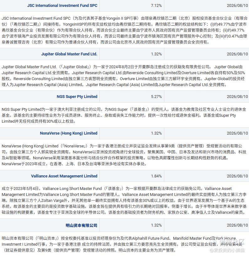 - JSC International Investment Fund SPC:认购7.12%,是一家专注于高成长科技领域的国际专业投资基金,具备丰富的全球科技产业投资经验。