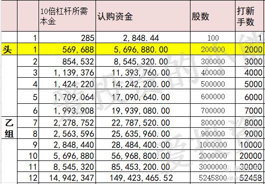 乙头需要认购资金570万,乙组的各档融资所需要的本金还有融资金额对应如下表: