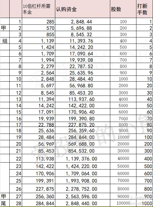 甲组的各档融资所需要的本金还有融资金额对应如下表: