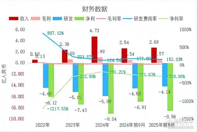 公司2024年及2025年前9个月收入稳步增长,毛利同步提升,研发投入保持高位,仍持续处于亏损状态。截至2025年9月30日,公司经营活动现金流-5.49亿元,账上现金3.40亿元。