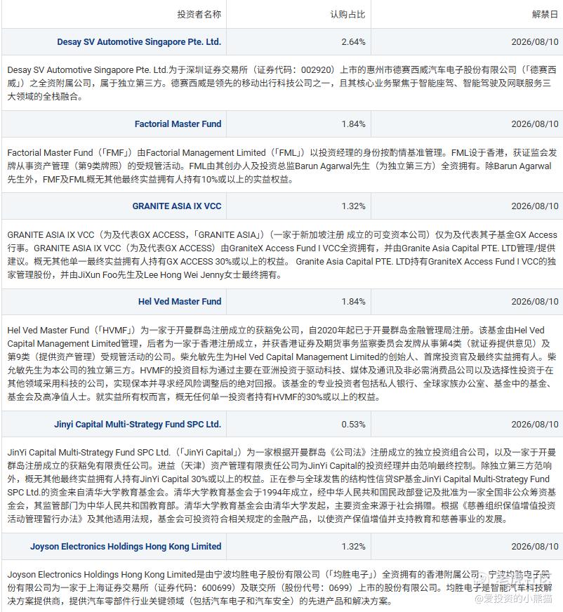 - Factorial Master Fund、Hel Ved Master Fund、Valliance Asset Management Limited:各认购1.84%,均为国际知名专业投资基金,在全球科技赛道拥有成熟的投资布局与资源整合能力。