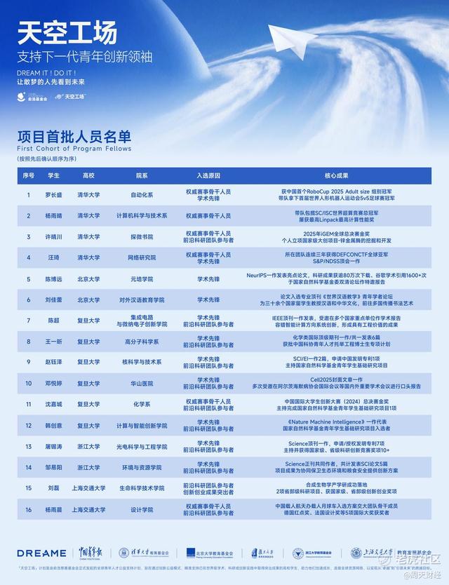 首批入选者来自清华大学、北京大学、复旦大学、浙江大学、上海交通大学等顶尖高校,研究领域横跨人工智能、工程技术、基础科学、人文研究、语言文化与设计创新等,每一位都已在各自领域崭露头角。