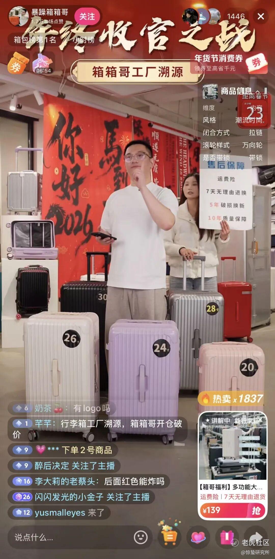 “箱箱哥”告诉惊蛰研究所,2025年“暴躁箱箱哥”粗略估计已拿下了1.5亿GMV,而在2026年,他的目标是让GMV再翻一倍。“我一个人的精力是有限的,所以我希望可以从团队内部孵化出更多红人主播,结合不同人群的需求、不同产品的定位,复制出更多成熟稳定的直播间,实现红人店播的规模化。”