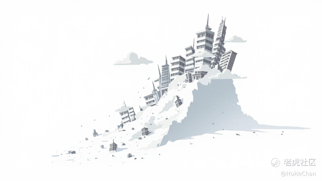 建立在悬崖边缘的云端建筑群正发生雪崩式崩塌,科技大楼倾斜滑落