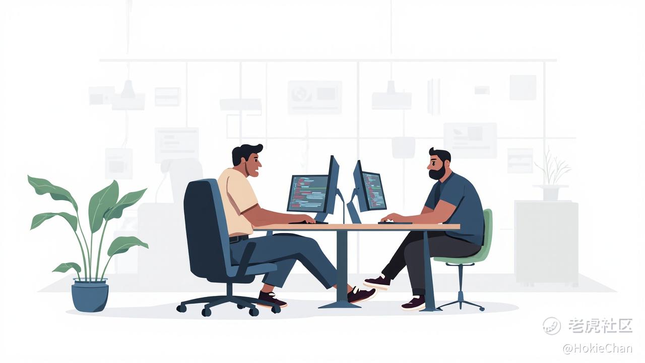 明亮的开放式办公室里,一位便装程序员专注地看着多台显示器