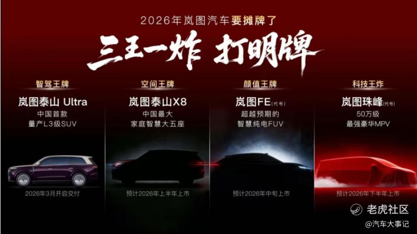 1月28日,东风岚图发布2026年产品计划,宣布将推出四款全新车型,包括中国首款量产L3级SUV岚图泰山Ultra、“庭院级大五座SUV”岚图泰山X8、代号为“FE”的全新FUV,以及代号为“珠峰”的“50万级行业最强”MPV,该布局旨在覆盖SUV、FUV及MPV三大主流品类,全面强化品牌在高端新能源市场的竞争力。