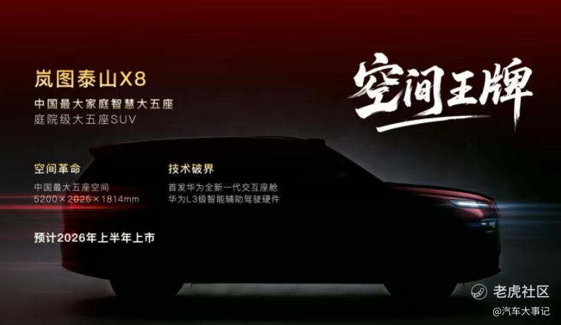智能化方面,岚图泰山X8将搭载**最新一代智能座舱系统,并配备L3级智能辅助驾驶硬件,该车型将于2026年上半年上市,是东风岚图扩充SUV产品矩阵的重要车型。