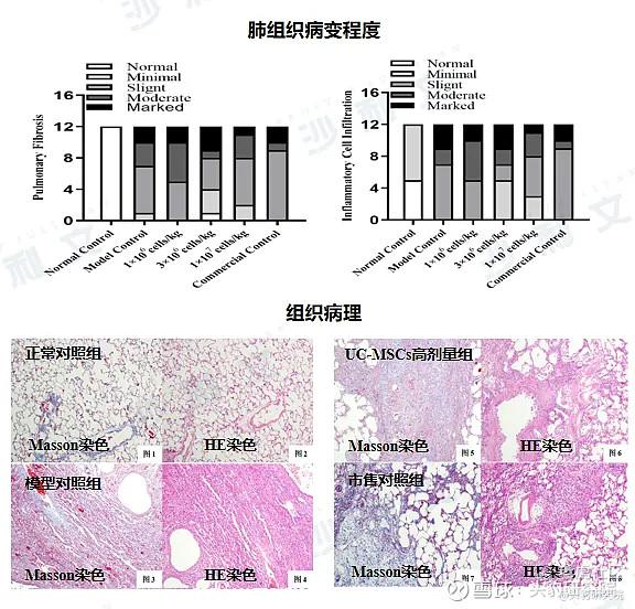 为提高临床治疗效果,公司依托种源筛选方法,筛选出具有更强分化和免疫调节能力的细胞批次,并通过检测相关细胞因子分泌水平进一步筛选。有研究表明脐带间充质干细胞通过分泌HGF激活PI3K-AKT-mTOR信号通路,减轻博来霉素诱导的小鼠肺纤维化水平;且IL-10作为一种抗炎因子,可减轻炎症反应,也可减轻肺纤维化程度,选择此两种细胞因子作为肺纤维化的筛选标志。最后,再通过建立TGFβ1诱导支气管上皮细胞的上皮-间质转化过程以及博来霉素诱导支气管上皮细胞损伤两种细胞水平的肺纤维化模型,再次从功能学评价出效果最佳的干细胞批次,以此作为动物药效研究以及临床研究所需干细胞种源。数据显示,经筛选后的干细胞与TGFβ1诱导的支气管上皮细胞共培养后,可显著提高MMP-7、CDH1表达,降低COL1A1、Vimentin表达,并抑制间质转化后的细胞迁移,表明干细胞发挥了抑制胶原沉积和上皮-间质转化进程的作用;同时将干细胞与博来霉素诱导的支气管上皮细胞共培养后,可抑制损伤的上皮细胞凋亡,上述细胞水平的疾病模型均体现了干细胞的抗纤维化作用。另外,采用大鼠气道内雾化给予博来霉素的方法建立动物水平的肺纤维化模型,结果显示不同剂量的干细胞(低剂量组:1×106 cells/kg、中剂量组:3×106 cells/kg、高剂量组:1×107 cells/kg)均对肺功能、存活率和肺组织病变程度具有显著改善作用,且具有一定的剂量依赖性。通过体内和体外的药效评价,充分证明了经种源筛选后的干细胞产品的有效性。