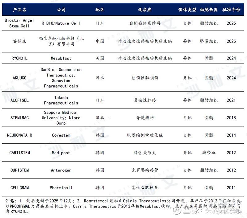 干细胞治疗的商业化取得了实质性进展。韩国和日本在政策优势下,截至25年12月,韩国已获批用于治疗肌萎缩侧索硬化症、膝骨关节炎、克罗恩病瘘管、和急性心肌梗死的干细胞药物,日本已获批用于治疗自闭症谱系障碍、创伤性脑损伤、复杂性肛瘘和脊髓损伤的干细胞药物。2024年,美国首次批准了用于儿童激素难治性急性移植物抗宿主病的骨髓来源干细胞药物RYONCIL。紧随其后,中国的异体脐带源干细胞药物“睿铂生”也获批用于相同适应症。这不仅意味着全球主要市场均已打通干细胞药物的完整上市通路,更标志着中国在顶尖干细胞药物的研发和注册能力上已实现与国际前沿接轨。