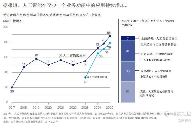 从2023年至2025年,企业AI转型规模化提速态势。QuantumBlack发布的《2025年人工智能的现状:智能体、创新和转型》,对全球105个国家,涵盖不同行业、规模企业、专业领域及资历层次的近2000名受访者,进行了调研,几乎所有行业的AI使用量均呈上升趋势。