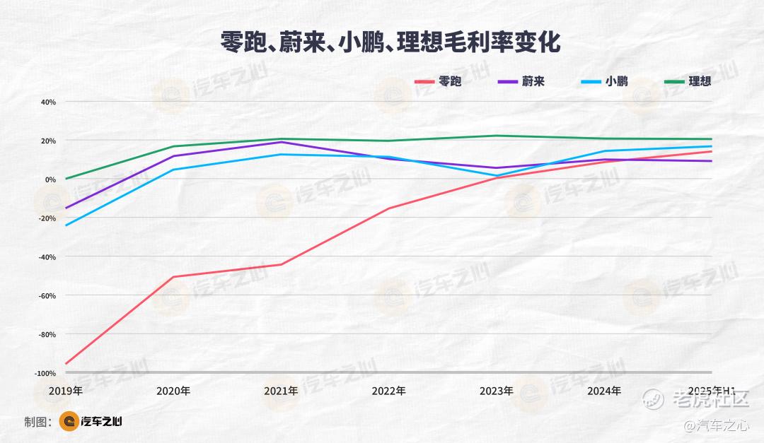 零跑毛利率第一次转正时,已经成立了8年,最低是2019年的-95.7%,2025年上半年,零跑毛利润持续涨至14.1%,接近行业15%~20%的正常水平。