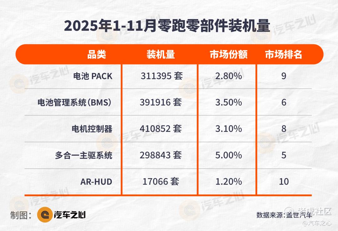 盖世汽车数据统计,2025年1-11月供应商装机量排行榜中,零跑在多合一主驱、电机控制器、BMS、电池PACK、自动泊车、AR-HUD等零部件产品均跻身TOP10。