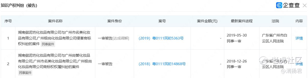 然而2021年5月广州极尚就注销了。在注销之前,广州极尚被广州市白云区环境保护局申请执行了行政案件,还因商标侵权被湖南御泥坊化妆品有限公司起诉过2次,其中在《2019)粤0111民初5363号》中,达成调解。而这些案件,也可能是广州极尚主动申请注销的重要原因。