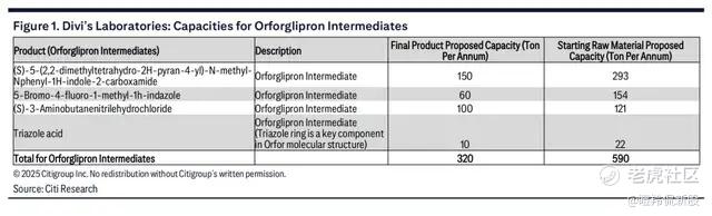 印度的迪维实验室(Divi's Laboratories)为Orforglipron新建了超300吨的中间体产能,以及近600吨的产品起始物料产能。花旗预计,迪维实验室将有望从这300吨的中间体产能中获取超5亿美金的年收入,预计占据整体产业链至少25%的价值量。