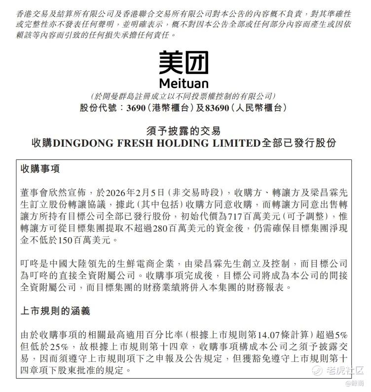 2026年2月5日,香港联交所的一纸公告,为持续数月的行业猜测画上了休止符,同时也引爆了中国互联网与零售圈:美团将以约7.17亿美元的初始对价,完成对叮咚买菜中国业务的100%股权收购。