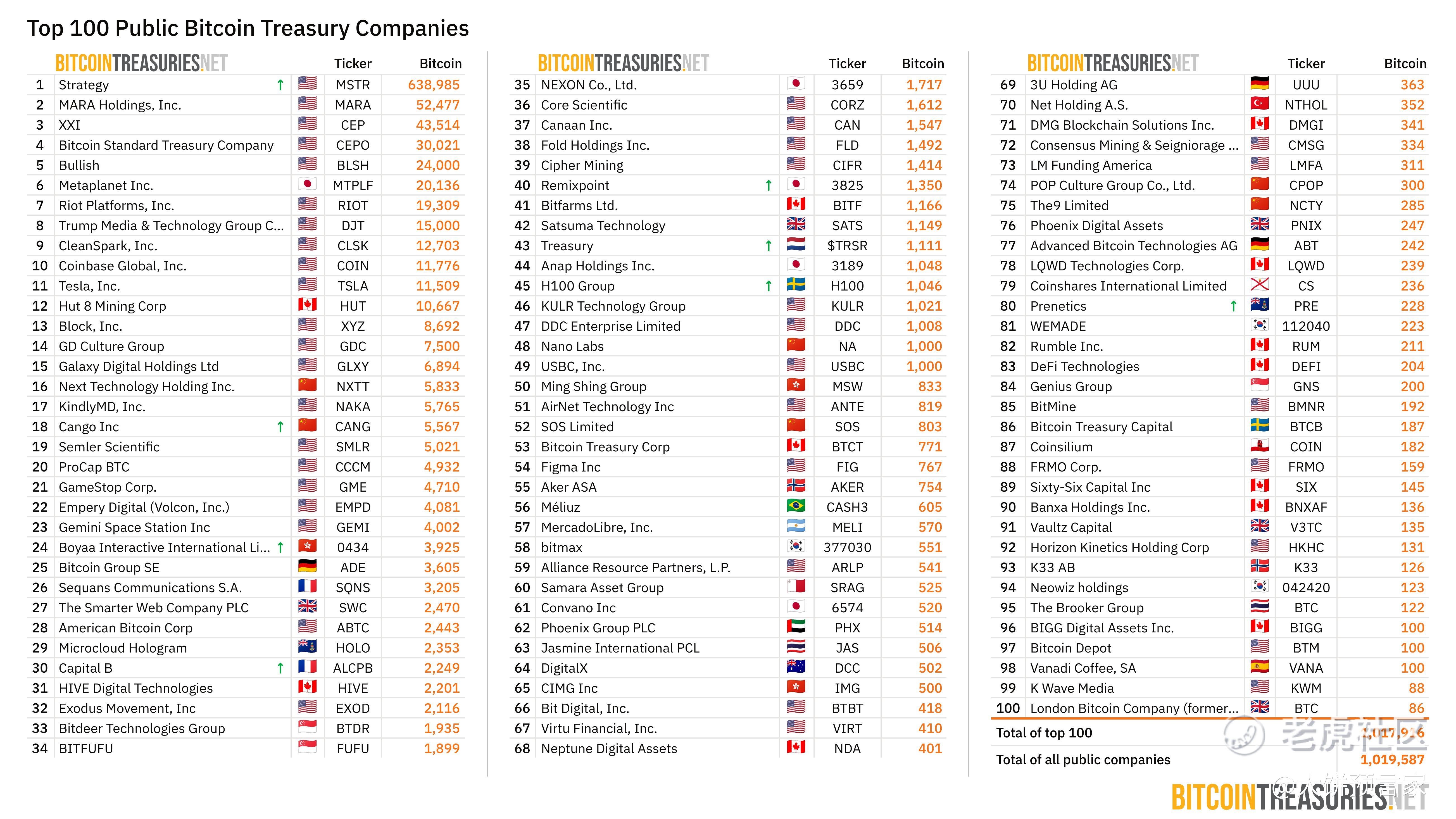 目前全球已经有100家公司,一共囤了101万枚大饼。