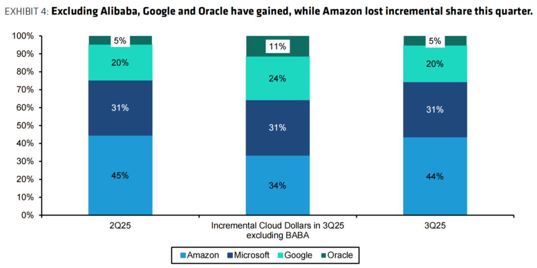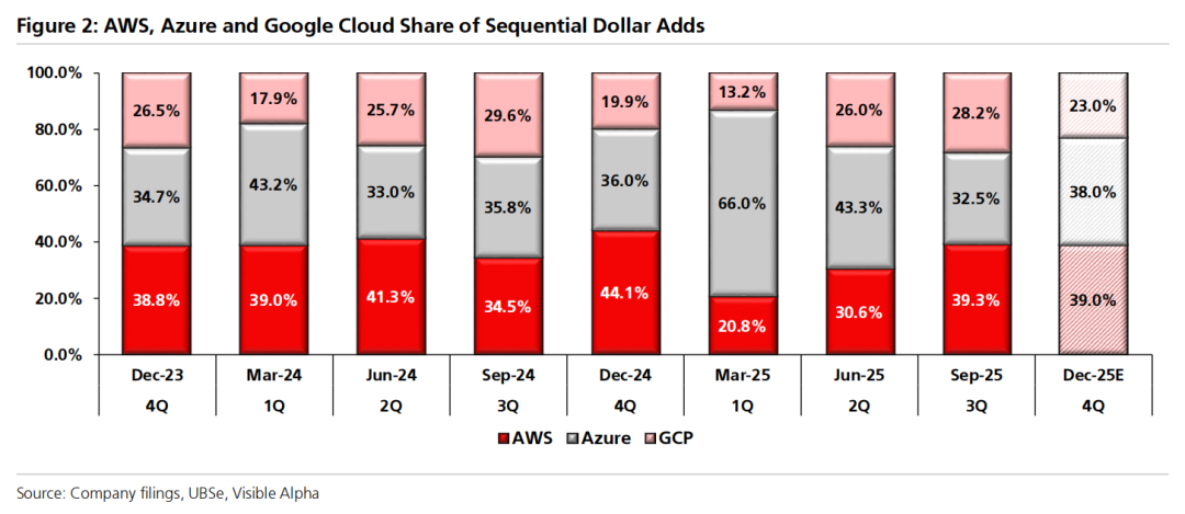 亚马逊的AWS作为“老大”,是增量里最稳定的承接者,多数季度都能占到35%-45%左右,底盘很稳。微软的Azure的波动更大,有的季度在30%出头,但2025年一季度直接冲到了66%,吃掉了绝大部分当季新增收入。谷歌的Google Cloud体量相对小一些,但也很多次贡献了20%-30%的增量,在竞争中的存在感明显变强。