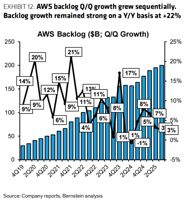 可以看到,AWS的积压订单一直在稳步抬升,三季度到了2000亿美元,只是季度增速在放缓。但有个细节很关键,AWS光是10月的签约量,就超过了整个三季度的成交量,这说明什么?说明新增订单并没有“降温”,后面收入释放的弹性依然很强。