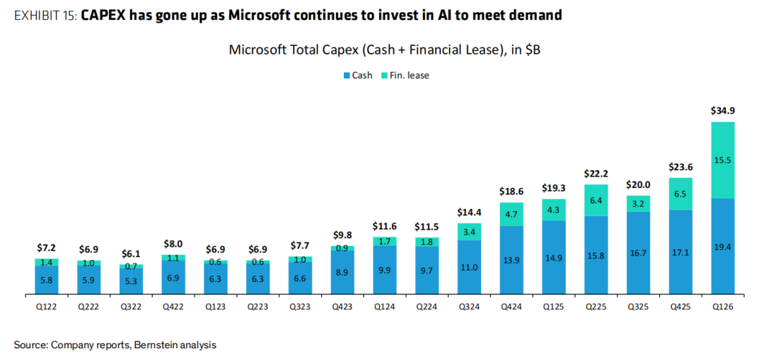 相比之下,市场对微软2025年资本支出预期在840亿美元左右,乍一看没有那么“炸裂”,但其实它并不保守。微软在三季度这一个季度的资本支出已经接近350亿美元,同比大增74%。更关键的是,在云和AI相关的投入中,有一半砸在GPU、CPU这样使用年限比较短的资产上,这意味着折旧会更快,对利润率的影响也更直接。