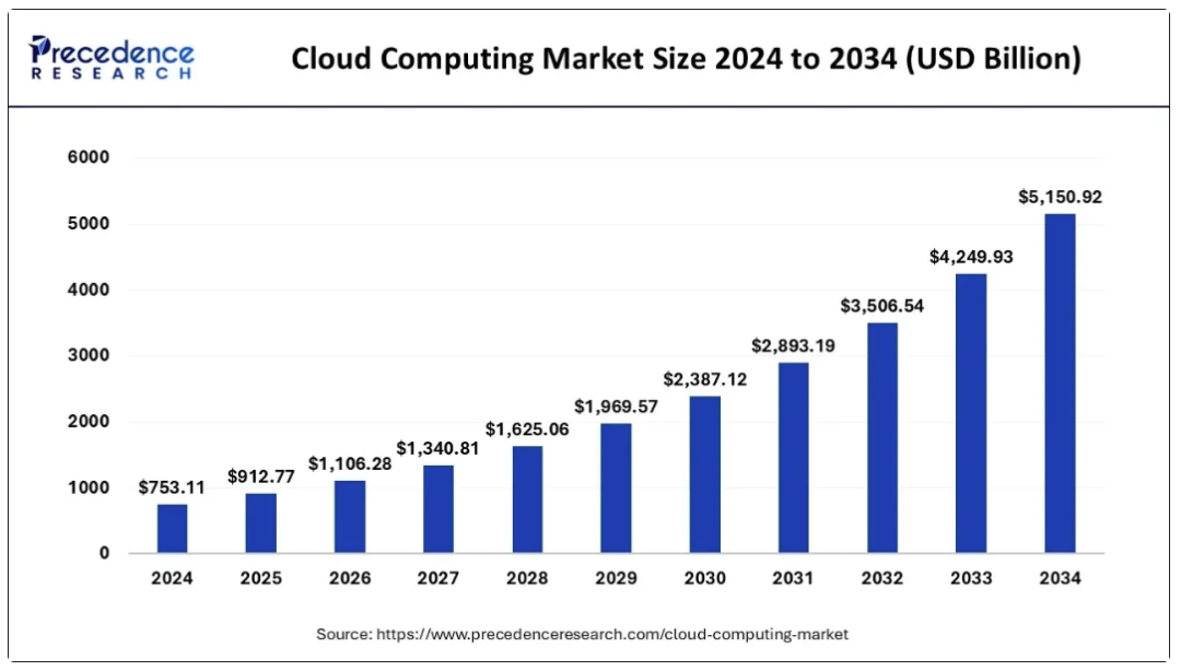 数据显示,2025年全球云计算市场规模已经超过9000亿美元。如果未来十年还能继续保持超过20%的复合增长率,这么算,到2034年,全球云计算市场规模很可能会迈过5万亿美元这个量级。