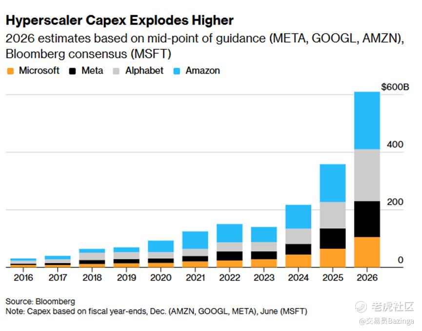 四大科技巨头谷歌、META、微软、亚马逊预计2026年资本支出Capex合计将达约6500亿美元,主要砸向AI数据中心与相关设备,规模堪称本世纪罕见的基建潮。