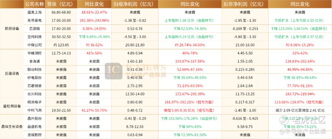 后道设备领域尽管大部分企业未披露营收数据,但利润普遍实现大幅增长,长川科技成为该领域的增长冠军,预计归母净利润12.5亿元至14亿元,较上年同期的4.58亿元增长172.67%至205.39%,扣非后归母净利润11.75亿元至13.25亿元,同比增长183.72%至219.94%。后道设备企业利润大增,主要得益于半导体行业需求持续复苏,下游客户设备采购需求旺盛。不过该领域也有例外,矽电股份利润同比大幅下降39.04%-49.93%,公司称,业绩下滑一方面是受下游部分客户资本性支出阶段性放缓影响,收入规模有所下降;另一方面是因发行上市、实施募投项目等导致期间费用增加,直接影响了整体盈利表现。