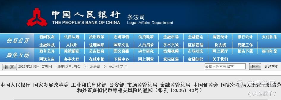 2月6日晚,央行、发改委等8部门联合发布《关于进一步防范和处置虚拟货币等相关风险的通知(银发〔2026〕42号)》。