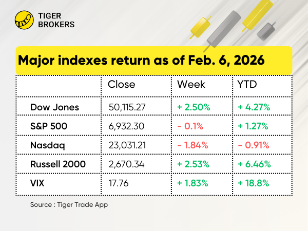 科技股承压:本周股市在首尾两端上涨,抵消了周中科技股遭抛售的跌幅。 $道琼斯(.DJI)$ 飙升 2.5%,史上首次收于 50,000 点上方; $标普500(.SPX)$ 500 微跌, $纳斯达克(.IXIC)$ 则下挫 1.8%。
