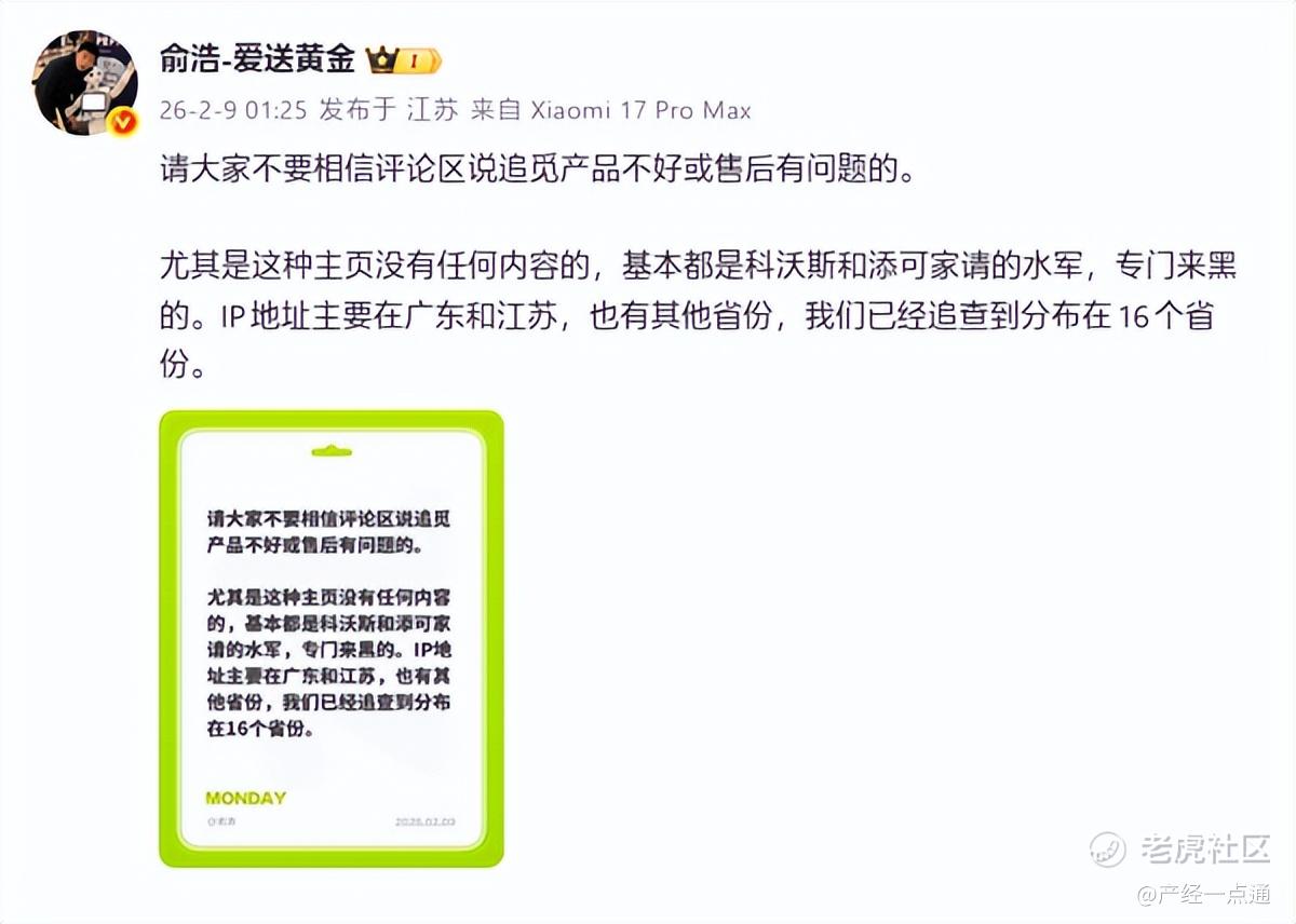 快科技2月9日消息,追觅CEO俞浩凌晨一点多发文表示:“请大家不要相信评论区说追觅产品不好或售后有问题的。”