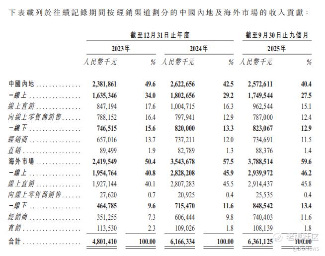 当海外占比达到57.5%与59.6%,品牌与渠道的全球执行力确实会成为一种壁垒。但更明显的难题是,海外生意同样更重平台。其招股书显示的渠道贡献里,2024年海外线上收入贡献为45.9%,截至2025年9月30日止9个月为46.2%。同时,海外线上直销在2024年为45.5%,截至2025年9月30日止9个月为45.8%。