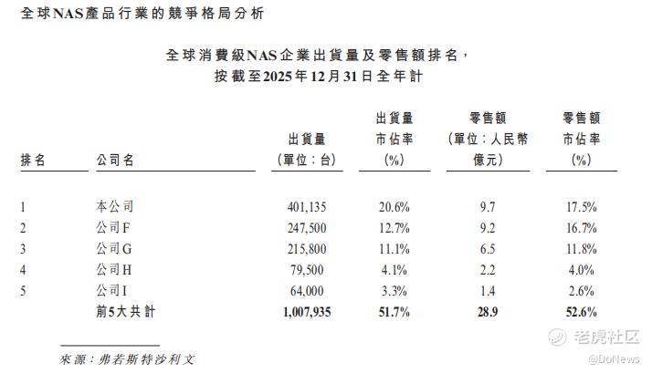 从配件滚动,到存储突进,这是一种明显的方向选择。它意味着绿联不满足于只做连接入口,而希望进入更重、更长周期的“数据归属”空间。这一步的诱惑很强,原因也很直观。招股书引用弗若斯特沙利文内容写到,截至2025年12月31日全年计,绿联在全球消费级NAS产品出货量市占率为20.6%,零售额市占率为17.5%。