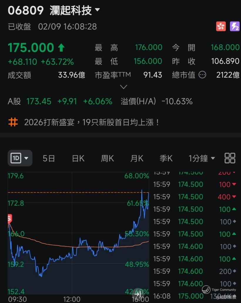 澜起首高开高走,大升6%,小纸中两手,暗盘拼手速$160放了一手,见富途低了4%,又换了一手,首日$168放完,大赚1万3