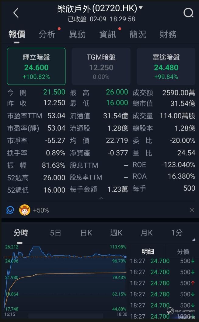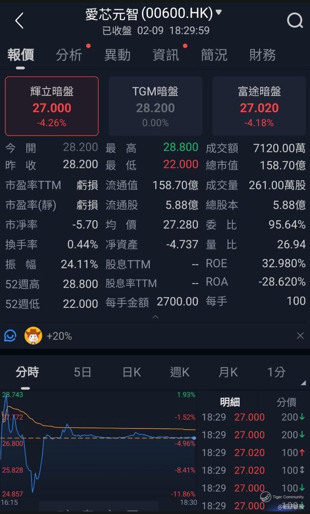 爱芯、乐欣今日暗盘,爱芯基本面差、估值高、货多,3大弱点集一身下,最高大跌20%,收盘跌4%,乙头中23手,蚀$2760