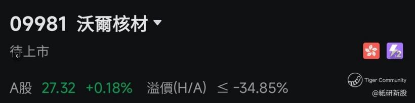 截至2月9日,沃尔A股收报$27.32,H股上限定价的话折价34.85%