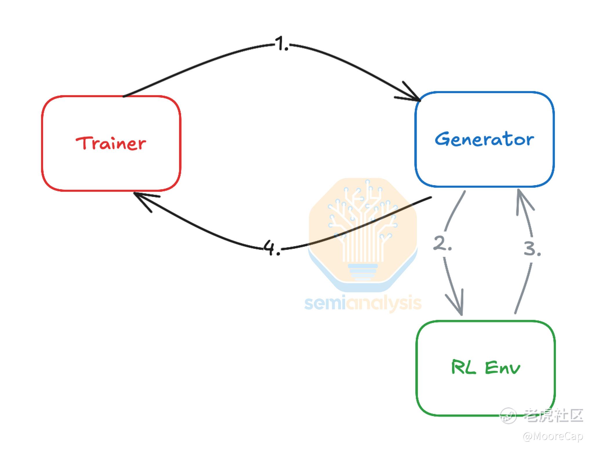 强化学习训练循环。强化学习环境中使用的 CPU(绿色)。来源:SemiAnalysis