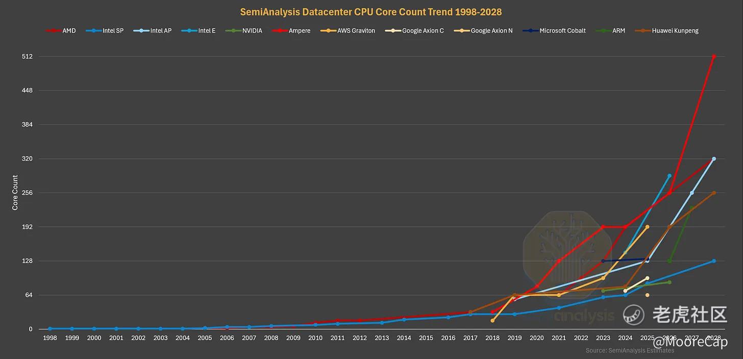 数据中心 CPU 核心数趋势。数据来源:SemiAnalysis 预测