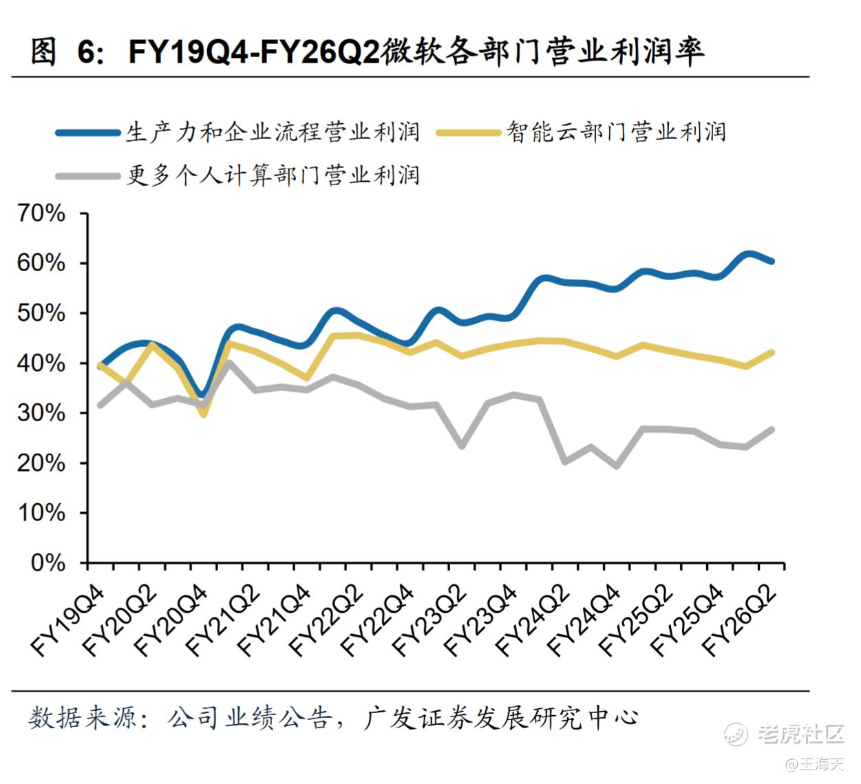 根据2026财年Q2财报,微软生产力和企业流程部门收入达 341.16亿美元,同比增长 15.9%;而相比之下,个人计算部门(含Windows)仅为142.5亿美元,且同比出现了下滑。更重要的是,生产力和业务流程板块的运营利润率多个季度维持在 50%以上,是微软名副其实的现金奶牛。