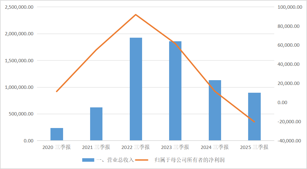 2025年前三季度,公司实现营业总收入89.86亿元,同比下降20.64%;归母净利润亏损2.04亿元,同比大幅下滑274.96%;扣非净利润亏损2.21亿元,同比降幅更高达348.89%。单季度数据显示,2025年第三季度营收27.37亿元,同比下降38.29%;归母净利润亏损1.35亿元,同比降幅达227.45%。