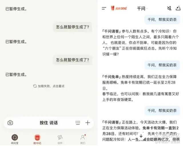 2月1日,腾讯元宝App在开启春节10亿元红包活动后,当用户尝试使用“春节模版做同款”等功能时,频繁出现“已暂停生成”的提示,服务出现短暂不稳定。无独有偶,2月6日,阿里千问App的“春节30亿免单”活动也因巨大流量涌入,在下单过程中多次出现卡顿现象,无法完成下单付款和分享。