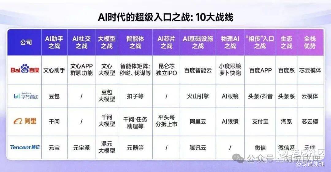 它取消了AI入口(文心助手)与主APP的物理隔离,选择将AI与搜索深度融合。这与阿里(通义千问)、字节(豆包)、腾讯(元宝)力推独立APP的策略形成了鲜明对比。