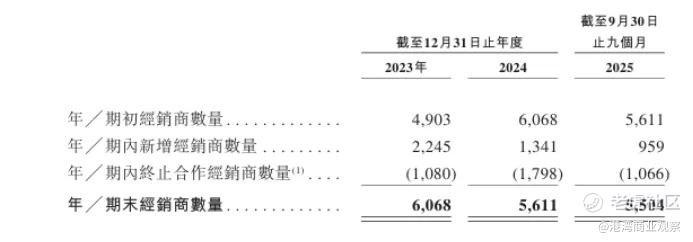 与此同时,经销商稳定性不足的问题凸显。报告期内,年内新增经销商分别为2245家、1341家、959家,终止经销商分别为1080家、1798家、1066家,2024年和2025年前三季度终止数量超过新增数量,反映出渠道管理面临挑战。报告期内,公司经销商数量分别为6068家、5611家、5504家,也呈现持续递减态势。