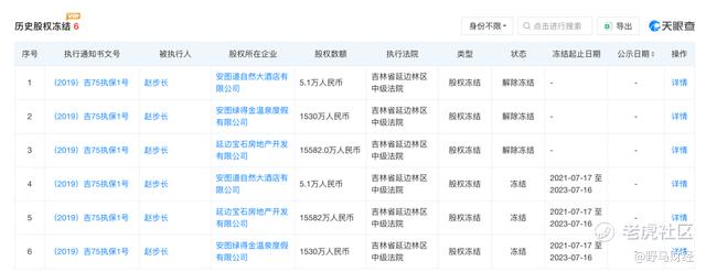天眼查历史股权冻结记录显示,他与安图道自然大酒店的江湖恩怨由来已久。早在2019年,赵步长就因相关案件被吉林省延边林区中级法院裁决,他在三家关联企业的股权均被冻结:包括:安图道自然大酒店5.1万元人民币股权、安图绿得金温泉度假有限公司1530万元人民币股权、延边宝石房地产开发有限公司(下称:延边宝石)1.56亿元人民币股权,上述股权冻结曾持续至2023年7月16日。