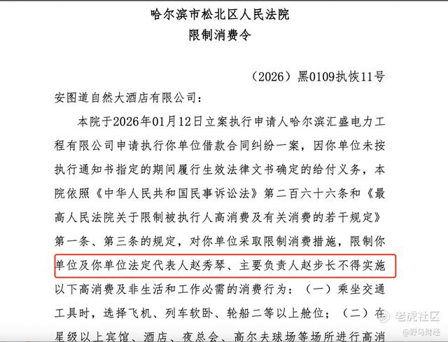 据中国执行信息公开网的信息,2026年1月,因未按执行通知书指定的期间履行生效法律文书确定的给付义务,哈尔滨市松北区人民法院日前对安图道自然大酒店有限公司(下称:“安图道自然大酒店”)采取限制消费措施,对公司法定代表人赵秀琴、主要负责人赵步长限制实施高消费及非生活和工作必需的消费行为。根据公开资料显示,赵步长现年84岁。