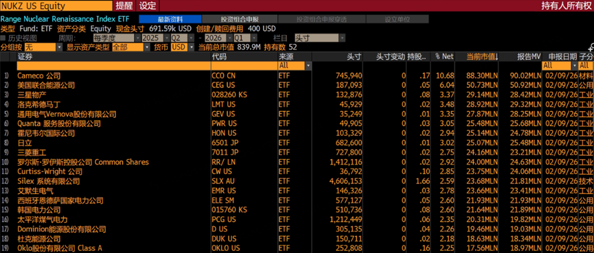 $Range Nuclear Renaissance Index ETF(NUKZ)$ 总资产约8.43亿美元,管理费率0.85%。当前第一大持仓为 $Cameco Corp(CCJ)$ ,权重约10.68%,该公司是全球主要铀生产商之一。整体来看,NUKZ围绕核能复兴主题布局,既覆盖铀资源,也涉及核电运营与设备制造企业,结构相对多元,更偏向核能产业链整体发展方向。