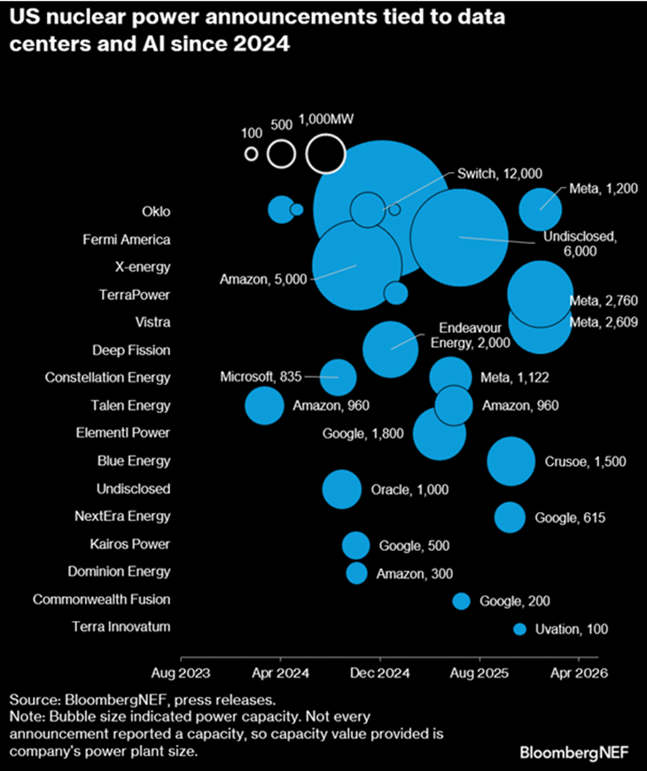 企业层面的决策已经落地:Microsoft、Amazon、Meta近年均签署与核电站相关的长期供电协议,用于支持其云计算与AI数据中心运营,合同期限多为15–20年。