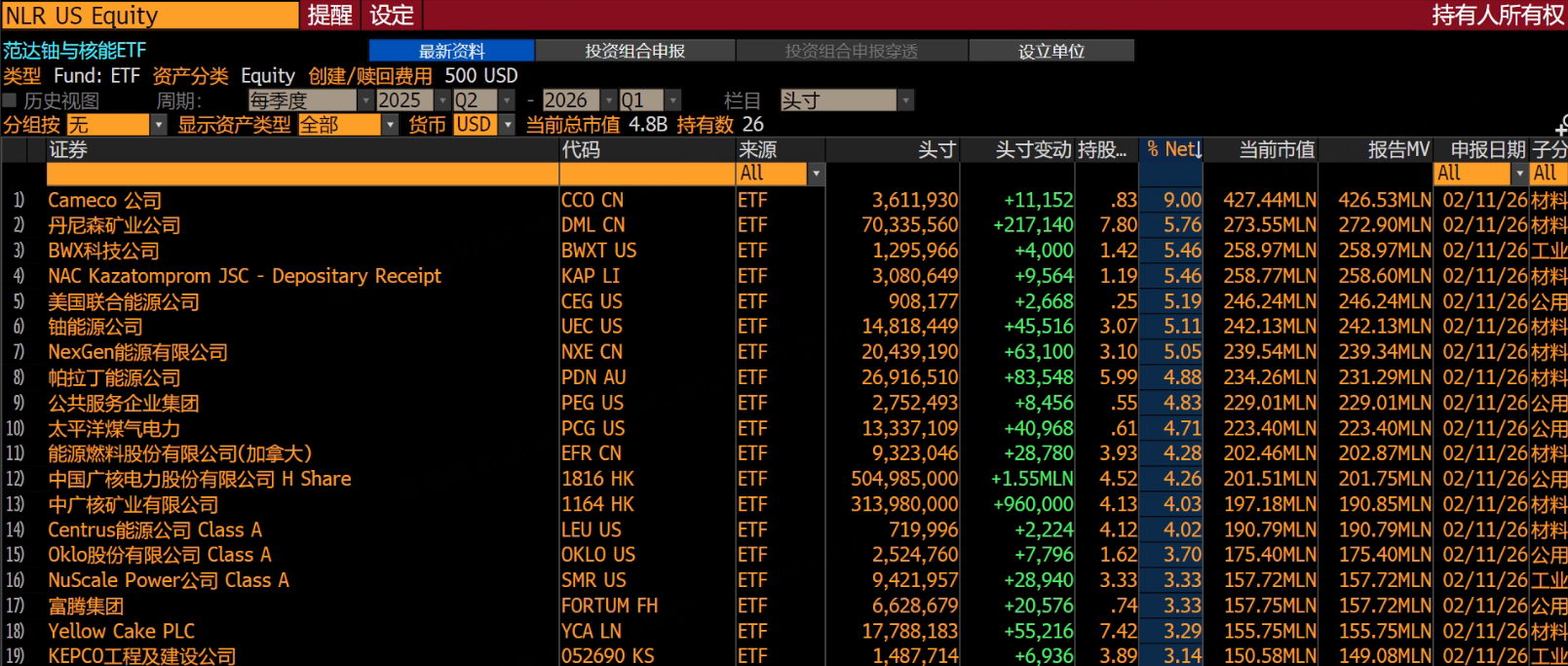 $核能指数ETF-Market Vectors(NLR)$ 总资产约47.89亿美元,管理费率0.50%。其第一大持仓为 $Cameco Corp(CCJ)$ (约 9.00%),其次为 $丹尼森矿业(DNN)$ (约 7.80%)整体配置集中在铀资源与核技术相关企业,但持仓数量较多,分散度高于纯矿业型产品。