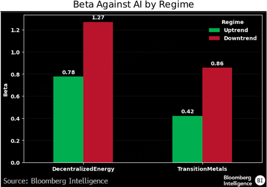 2025年AI指数上涨35%,转型金属上涨97%,分布式能源上涨52%。但当AI进入下行阶段,分布式能源的Beta(系统性风险)从0.78升至1.27,转型金属从0.42升至0.86,AI板块回调时波动会明显放大这些板块的波动。